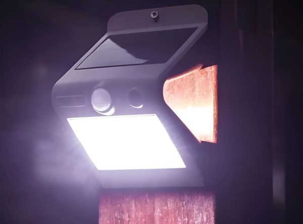 Solarbetriebene Fassadenbeleuchtung mit einer LED-Leuchte mit einem Lichtstrom von 400 Lm.